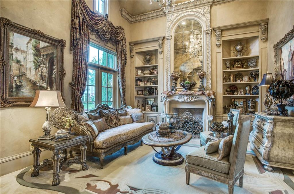 Situated on a private creek lot that's a little over a half an acre, this bold stone and brick mansion in Frisco, TX is located in the gated Starwood community. The French-inspired home features approximately 8,797 square feet of living space with five bedrooms, five full and two half bathrooms, two-story foyer flanked by stately columns, formal living and dining rooms with vaulted ceilings, gourmet kitchen with double islands and breakfast bar, breakfast room with fireplace, floating staircase, additional rear staircase, two-story family room with fireplace and piano bay, home office with vaulted ceiling, walk-in wet bar, wine cellar, game room with step ceiling and fireplace, home theater, and garage parking for four vehicles. Outdoor features include a covered porch, expansive covered terrace with fireplace, covered balconies, patios, a water feature, cabana with fireplace and BBQ kitchen, fire pit, and a swimming pool with spa.
